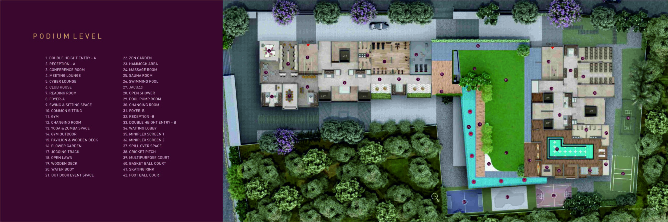 - Gym Jogging Track Yoga Deck Gymnasium with Changing Rooms Conference Room Meeting Lounge Cyber Lounge Club House Reading Room Foyer - A Common Sitting Jogging Track Zen Garden Outdoor Event Space Hammock Area Massage Room Jacuzzi Open Shower Pool Pump Room Miniplex Screens Cricket Pitch Multipurpose Court Basketball Court Skating Rink Football Court Meeting Lounge Cyber Lounge Outdoor Gym